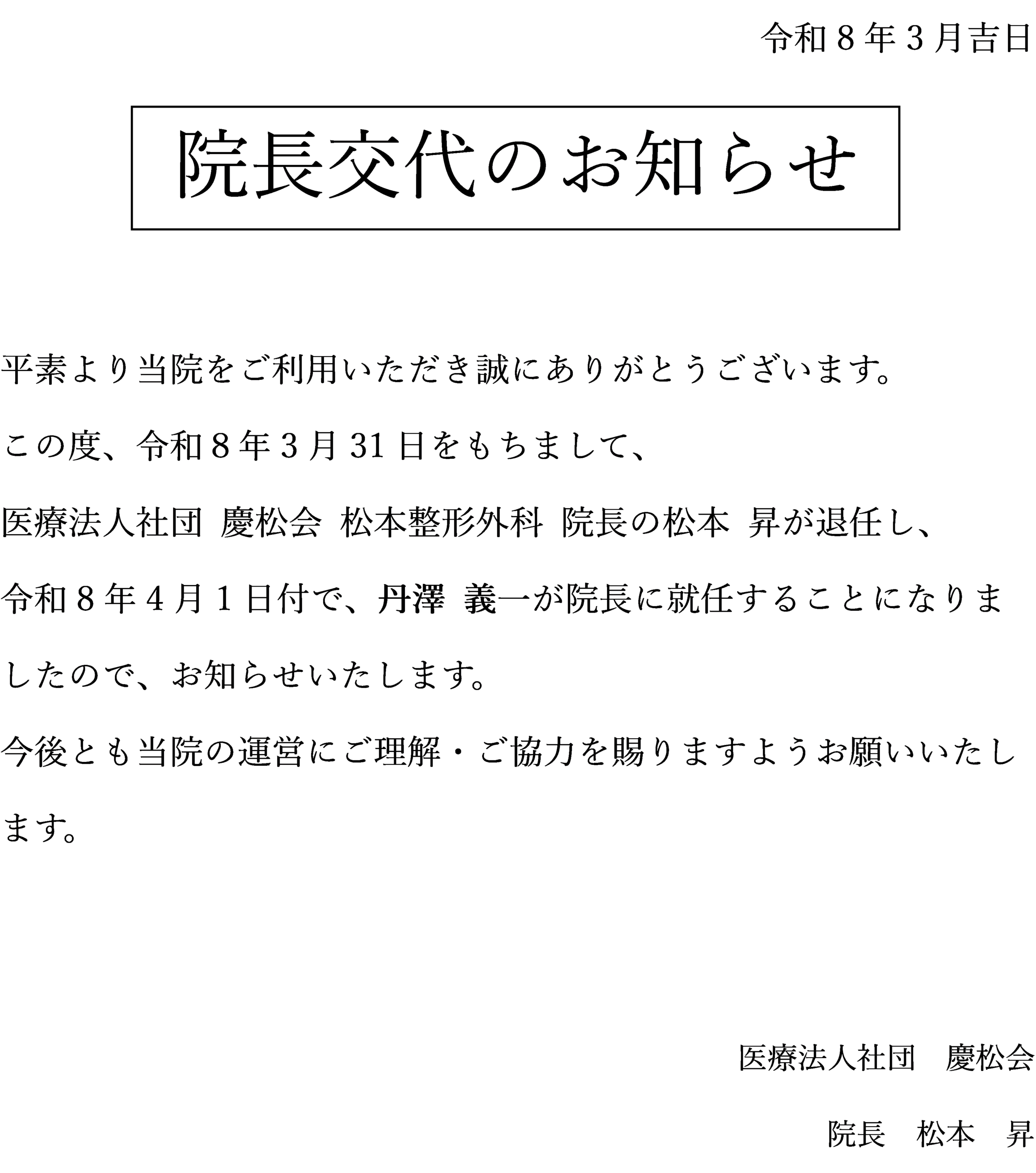 松本整形外科は、1991年1月、この地に開院以来、地域の皆様の「健康と福祉の促進」を目的に、地域医療に根ざしてまいりました。 整形外科本来の運動機能障害の治療はもとより、高齢化社会における「整形外科医」が担う、社会的責任は、ますます重大になると考えております。 私どもは、その専門医としてそれに関連する疾患を持ち、お悩みの患者さんに対して、誠意を持って問題解決することをモットーとして、今後も自己研鑽に努めてまいります。